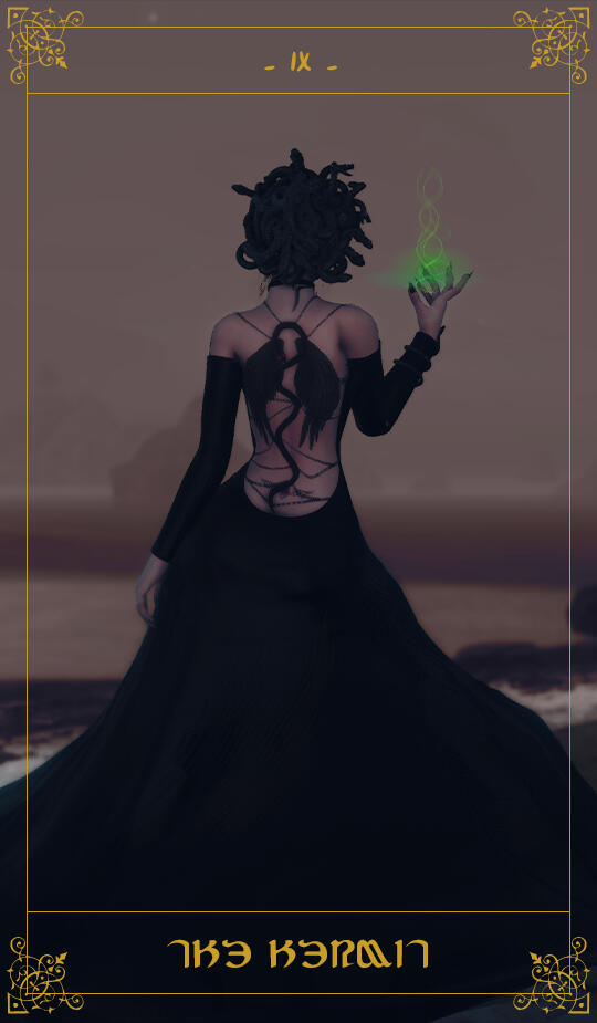 The Hermit is a seeker for the knowledge that comes from within. A lonely wanderer in the path of the night, she searches for that which can only be gained with long periods of solitude - the inner voice. To hear it, she must disconnect from the crowds whose voices and desires threaten to overcome her own. She walks through the dark night of his unconscious, guided only by the low light of the northern star, with her destination being her home, her self.
